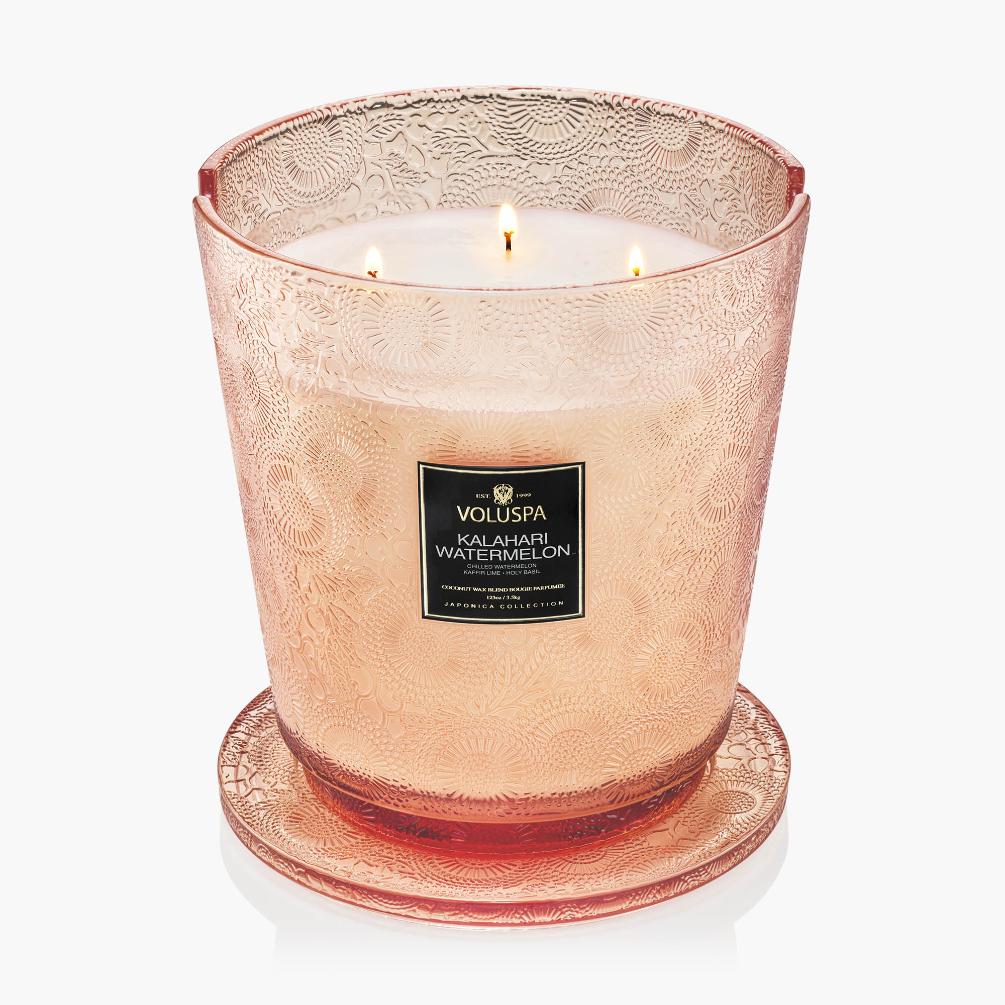 Voluspa’s unique coconut wax blend is housed in a 123 oz. embossed glass vessel and topped with a matching lid that keeps the candle dust-free when not in use. Our five wicks allow you to enjoy fragrance throw for 250 hours. Our candles are handcrafted in the United States and feature our proprietary, clean-burning coconut wax blend and natural wicks. Our products are free of phthalates, pesticides, parabens and sulfates and are never tested on animals. Up-cycle this best seller into a keepsake after the last burn.